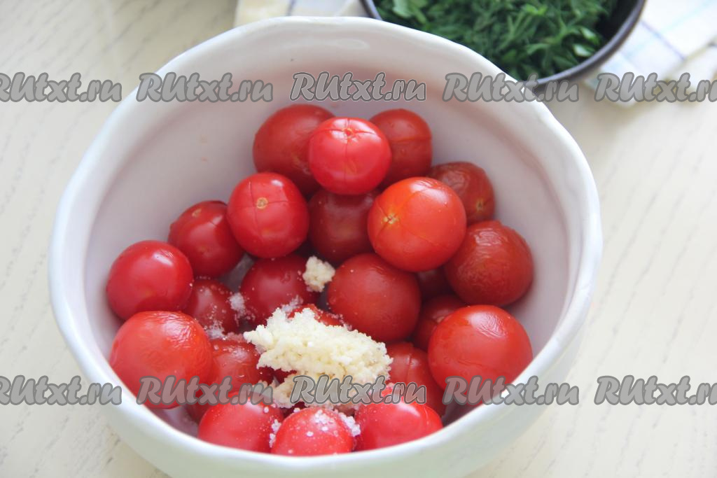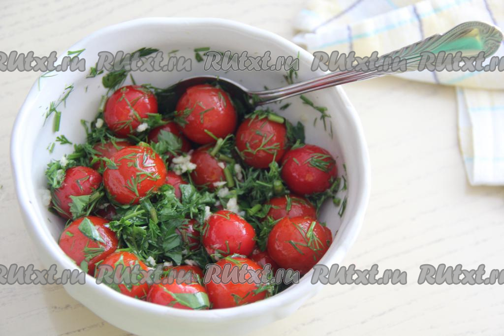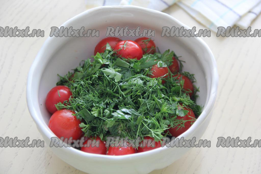 Перемешать помидоры черри с зеленью, чесноком и маринадом, поставить в холодильник на 1-2 часа.