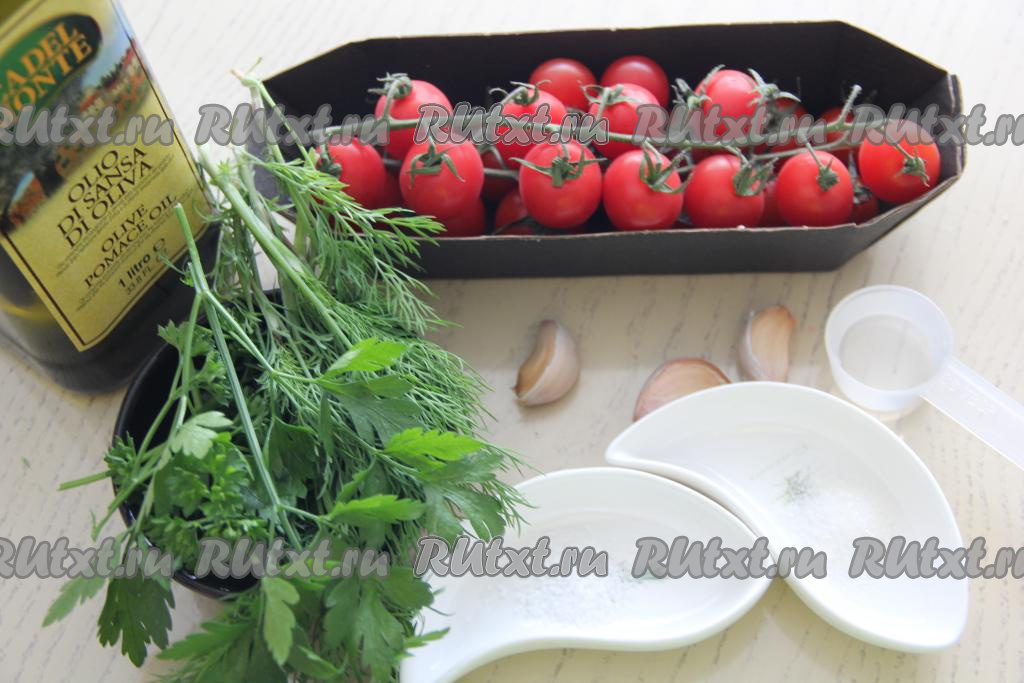 Подготовить продукты. Зубчики чеснока почистить. Черри и зелень вымыть.