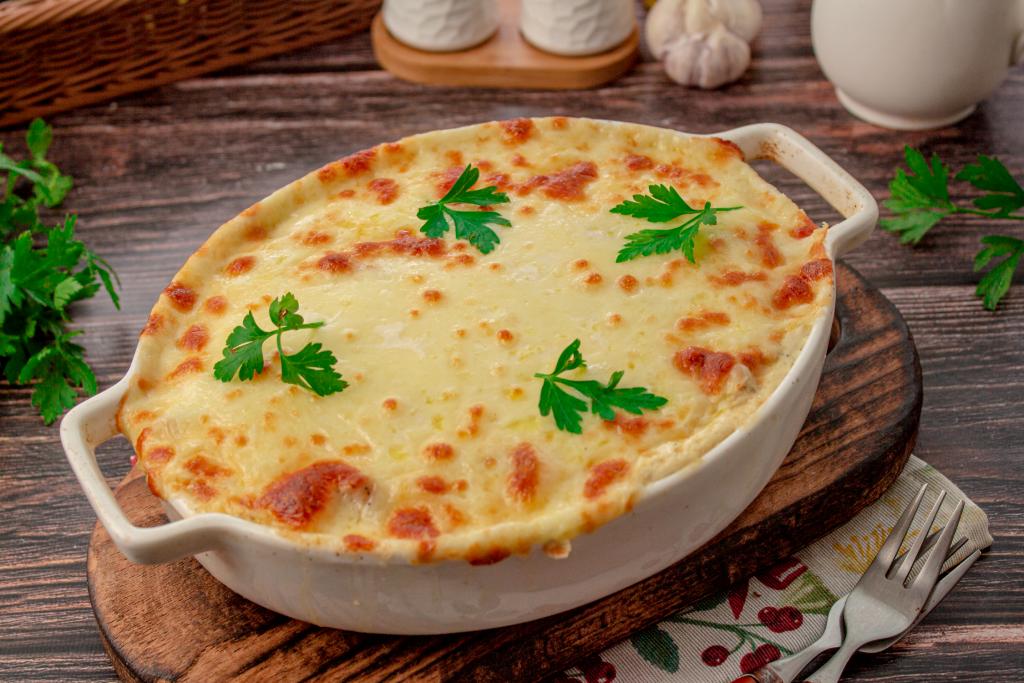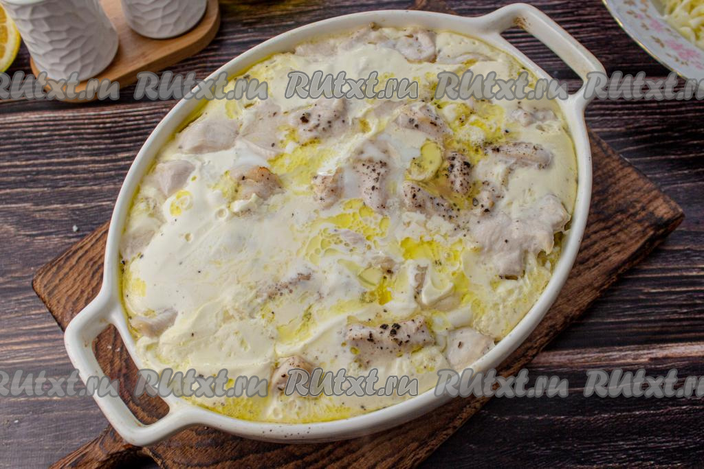 Залейте картофель с курицей сливочной заливкой.
