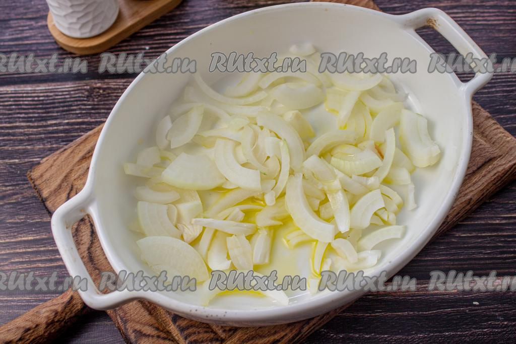 Очистите картошку, чеснок и лук. Форму для выпечки смажьте растительным маслом. Лук нарежьте на тонкие перья и выложите на дно формы.