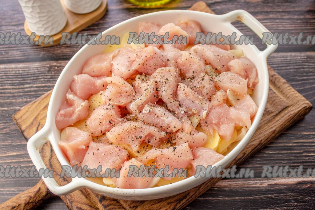Вымойте куриное филе и нарежьте его на небольшие кусочки, разложите поверх картофеля. Присолите и поперчите.