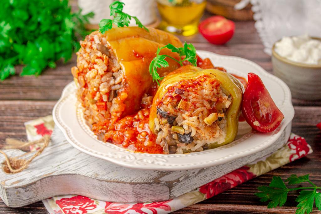 Готовые перцы, фаршированные рисом, овощами и грибами, подавайте тёплыми, поливая соусом, в котором они тушились.