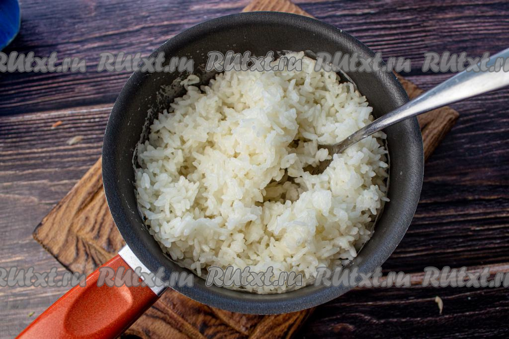 Рис хорошо промойте, слейте лишнюю воду. Переложите промытый рис в кастрюлю с кипящей подсоленной водой, перемешайте, после закипания варите на небольшом огне до готовности (минут 20). Готовый рис снимите с огня, откиньте на сито, дайте остыть.
