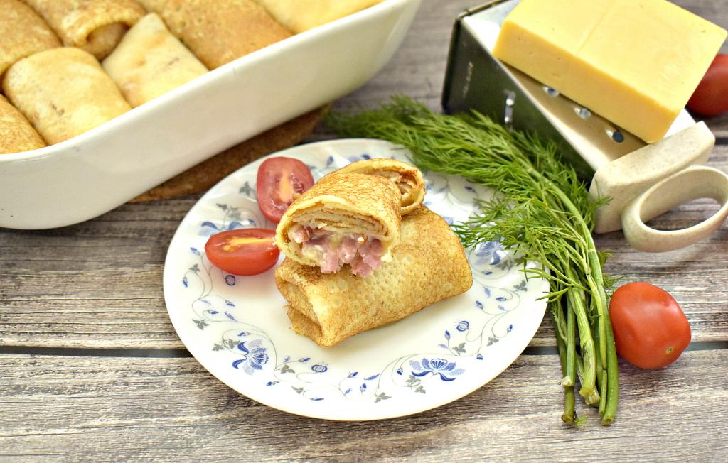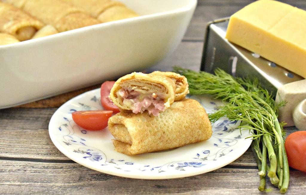 Очень вкусные, аппетитные блины, фаршированные сыром и ветчиной, подаём к столу тёплыми.