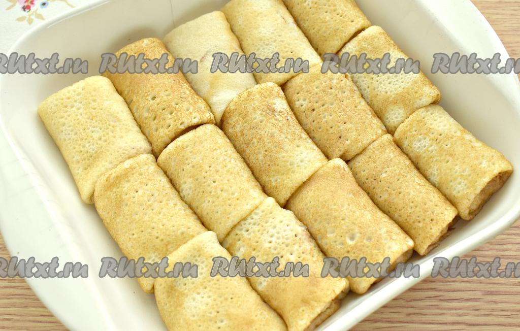 Аналогично сворачиваем все блины конвертиком и выкладываем их в форму для запекания, ставим в разогретую до 200 градусов духовку на 10 минут. За это время сыр внутри блинчиков расплавится. Можно также перед подачей обжарить блинчики с двух сторон на сковороде, смазанной сливочным маслом.
