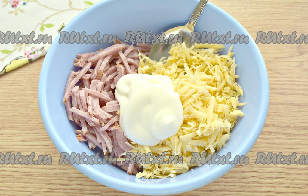 Ветчину нарезаем на тонкие брусочки, перекладываем в объёмную миску, добавляем майонез и натёртый на крупной тёрке сыр.