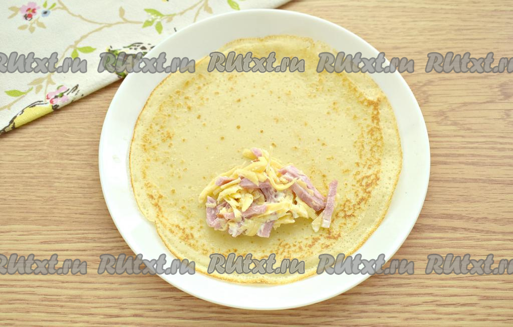 Параллельно с жаркой блинчиков приступаем к фаршировке. Выкладываем на блин столовую ложку начинки из ветчины и сыра, подворачиваем боковые края блинчика с двух сторон на начинку, а затем, сворачиваем блин в рулетик, начиная со стороны с начинкой.