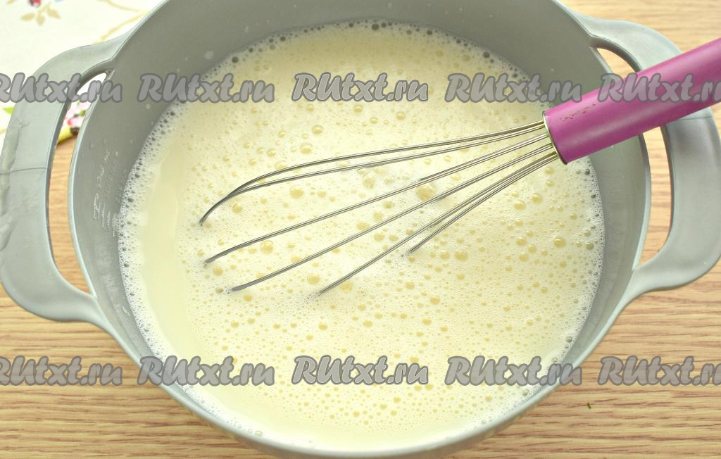 В яичную смесь тонкой струйкой, энергично перемешивая венчиком, вливаем кипяток и сразу же, не переставая активно перемешивать, добавляем свежее молоко из холодильника.
