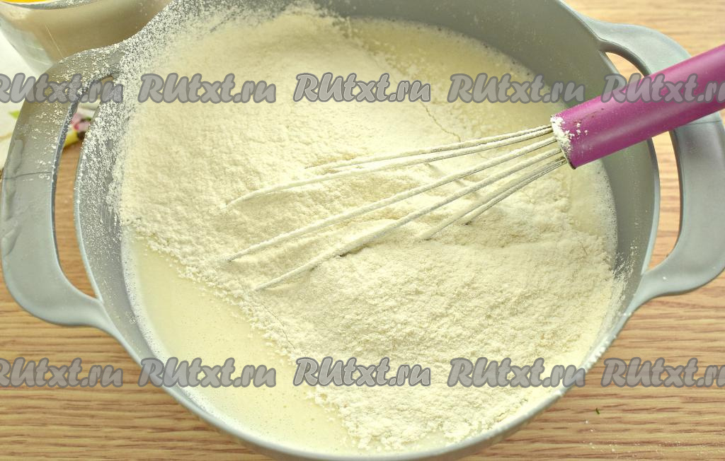 В получившуюся смесь всыпаем муку, перемешиваем до получения жидкого блинного теста без комочков.