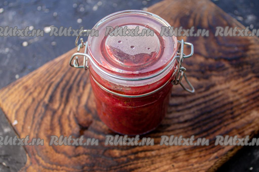 К этому времени подготовьте баночки для закатки. Стерилизуйте баночки удобным для вас способом. Мне нравится способ стерилизации в микроволновке, для этого в баночку заполняю, примерно, на 1/3 водой и ставлю в микроволновку на 5-6 минут при полной мощности (у меня мощность микроволновки 800 Ватт), затем аккуратно достаю, сливаю остатки воды. Крышки кипячу на плите с момента закипания воды 4-5 минут. Сразу после того как сняли соус с огня, разлейте его в подготовленные баночки и сразу герметично закройте (или закатайте) крышками.