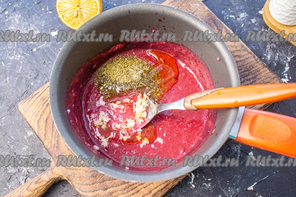В соус добавьте чеснок, пропущенный через пресс, соль, хмели-сунели, сахар и растительное масло, перемешайте, доведите до кипения. Затем варите соус на небольшом огне, иногда помешивая, до растворения соли и сахара (примерно, 7-8 минут). Кстати, соль используйте каменную, или ту, которая подходит для засолки. Йодированная или морская соль не подойдут.