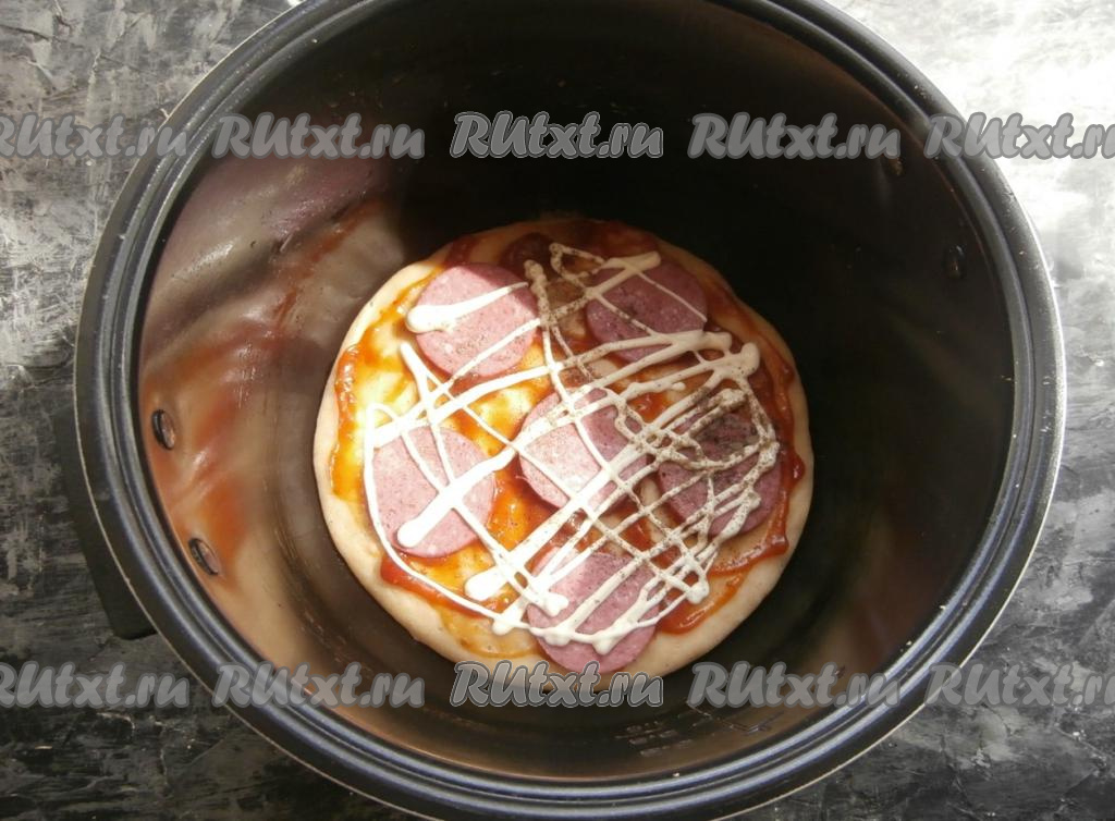 Готовить основу пиццы на режиме "Выпечка" 15 минут, затем крышку мультиварки открыть. Основу пиццы смазать сверху кетчупом, выложить кружочки колбасы, смазать немного майонезом, поперчить.