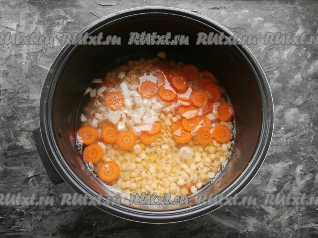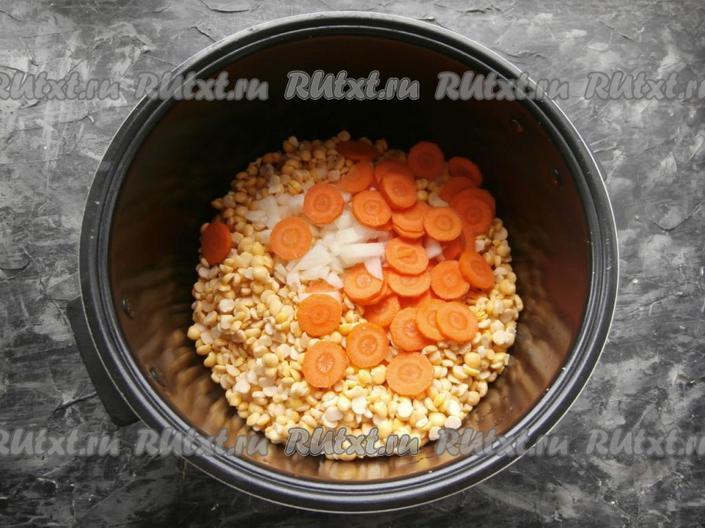 Морковку и лук почистить. Высыпать горох в чашу мультиварки, добавить нарезанные крупно лук и морковь.