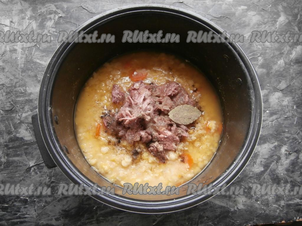 Гороховую кашу перемешать с тушёнкой и готовить на том же режиме мультиварки ещё 10 минут под закрытой крышкой.