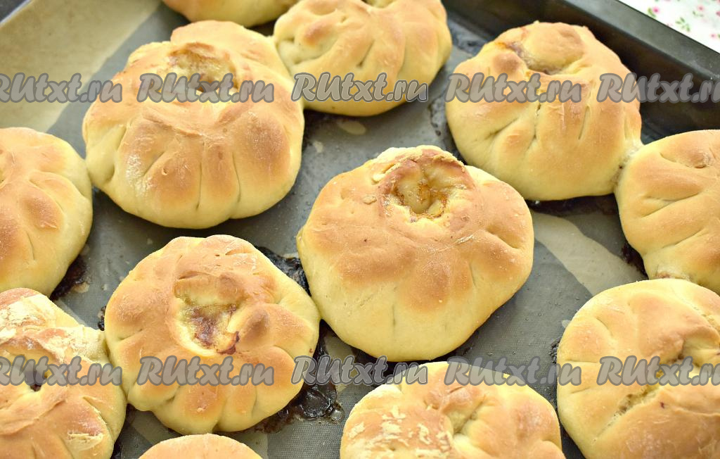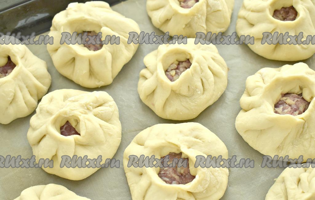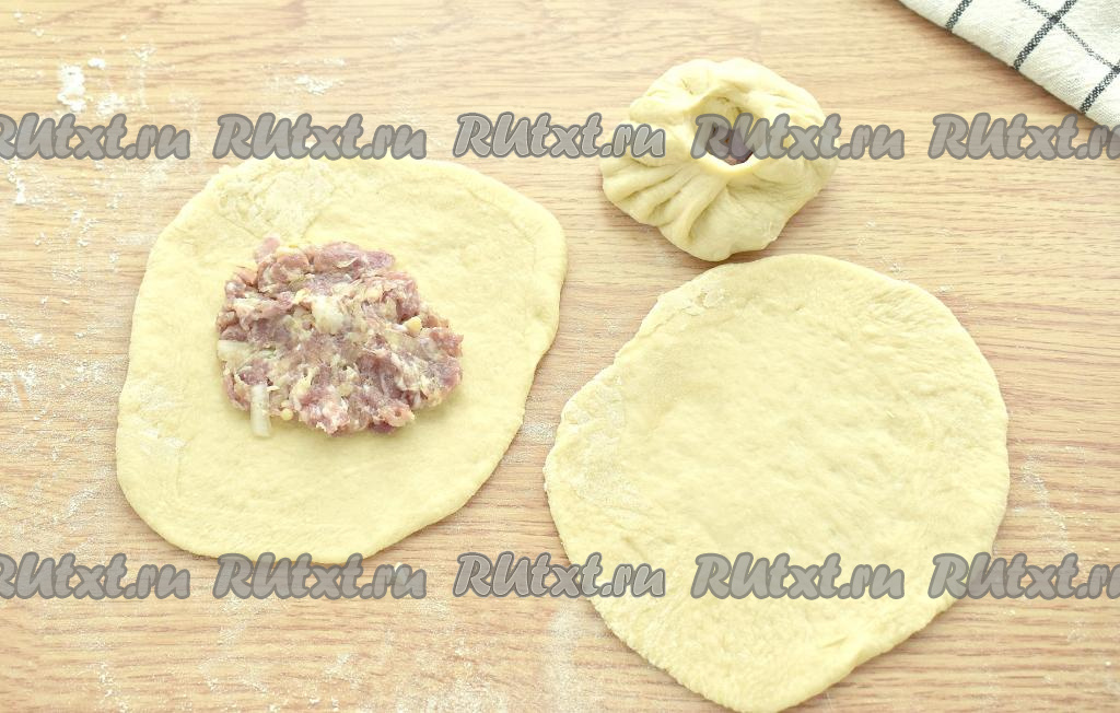 Теперь каждый кусочек дрожжевого теста раскатываем в лепёшку толщиной 3-4 миллиметра. В центр каждой лепёшки кладём по 1 полной столовкой ложке фарша. Поднимаем края каждой заготовки к центру, собирая складочками. Получается перемяч, как на фото, с отверстием в центре.