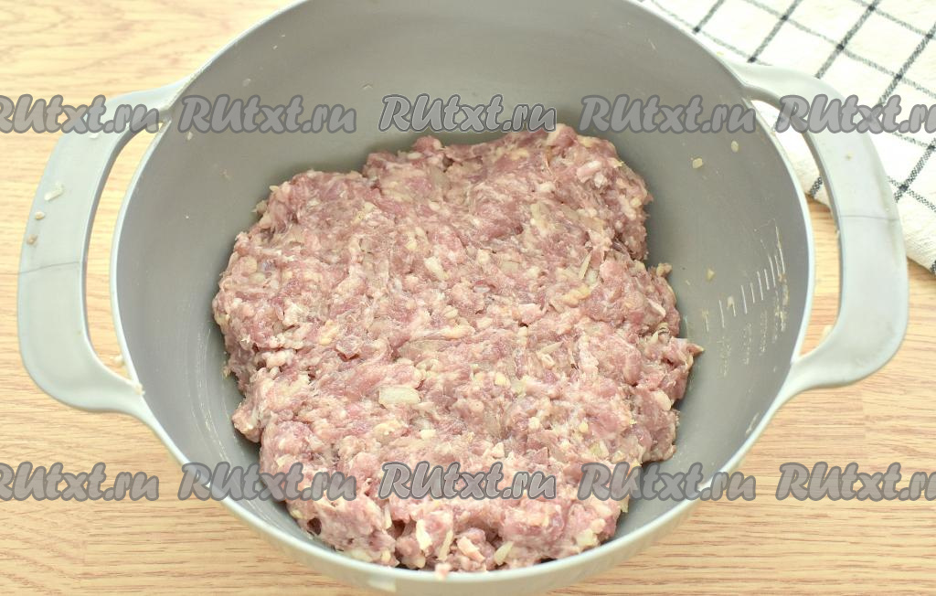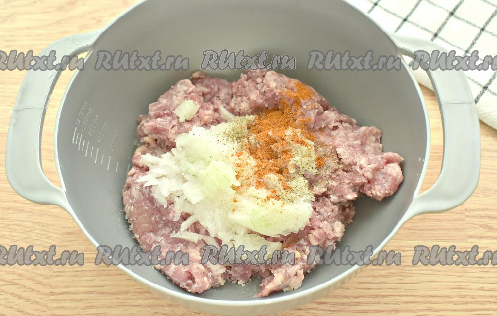 Пока тесто поднимается, можно сделать начинку. Для этого в миску выкладываем фарш, добавляем очищенную и мелко нарезанную луковицу, солим, приправляем специями (я добавила немного чёрного молотого перца и 2 щепотки паприки).