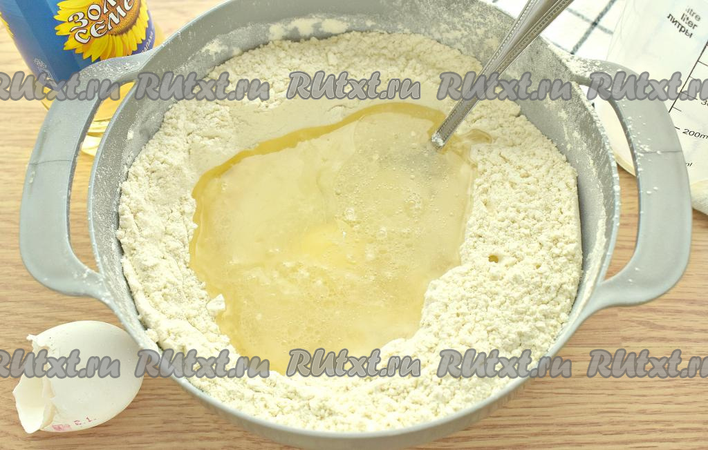 В получившееся углубление разбиваем яйцо, вливаем растительное масло и тёплую кипячёную воду (температура воды, примерно, 38 градусов).