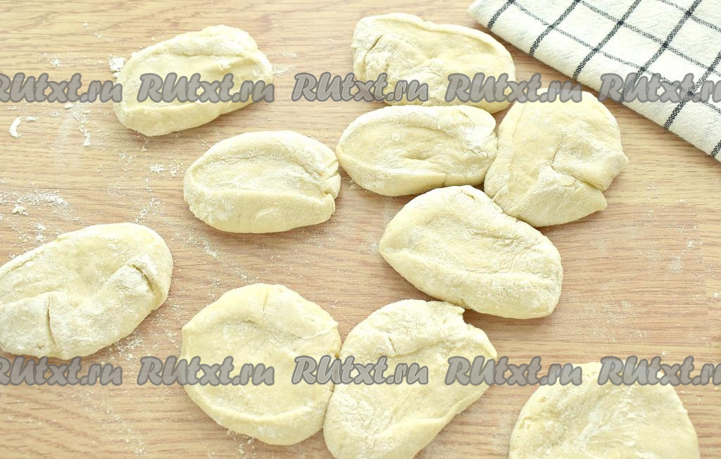 Поднявшееся дрожжевое тесто обминаем. Делим на 12 равных кусочков. Каждый кусочек теста прижимаем ладонью на припылённой мукой поверхности.