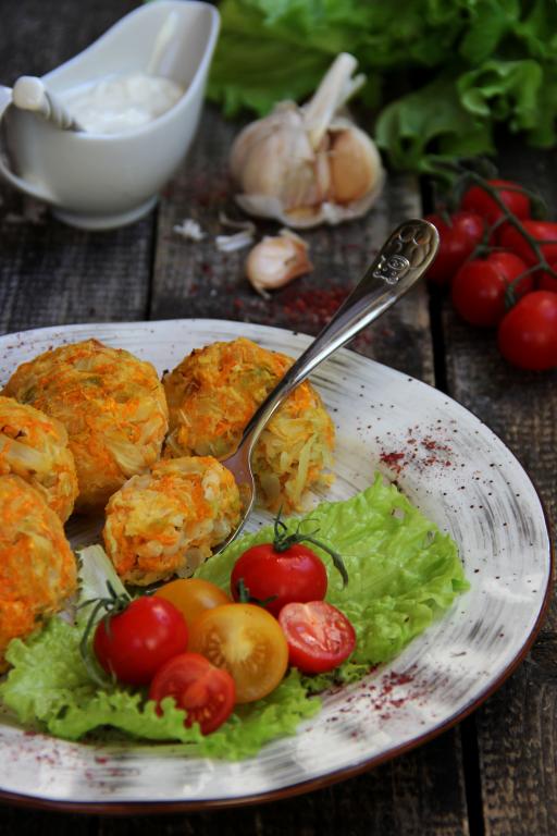 Вкусные, нежные капустные котлеты, приготовленные с добавлением манки, достать из духовки и, дополнив любимым соусом или сметанкой, подать к столу.