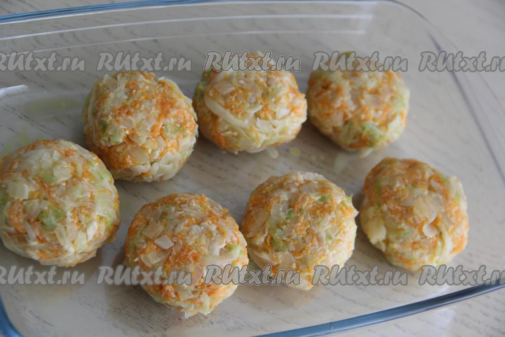 Из получившейся капустной массы сформировать котлеты. У меня получилось 7 штук. Выложить котлеты в жаропрочную форму, смазанную маслом.