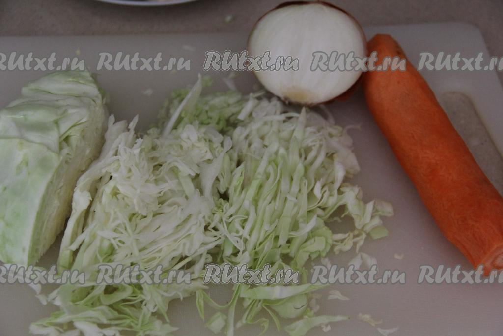 Капусту вымыть, если есть порченые листья, их нужно удалить. Тонко нарезать 400 грамм подготовленной капусты. Лук и морковь почистить.