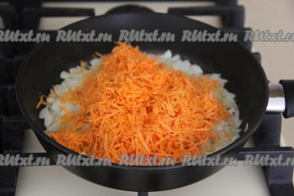 Затем добавить натёртую на средней тёрке морковку и обжаривать овощи, не забывая их перемешивать, минут 5-7 (до мягкости моркови).