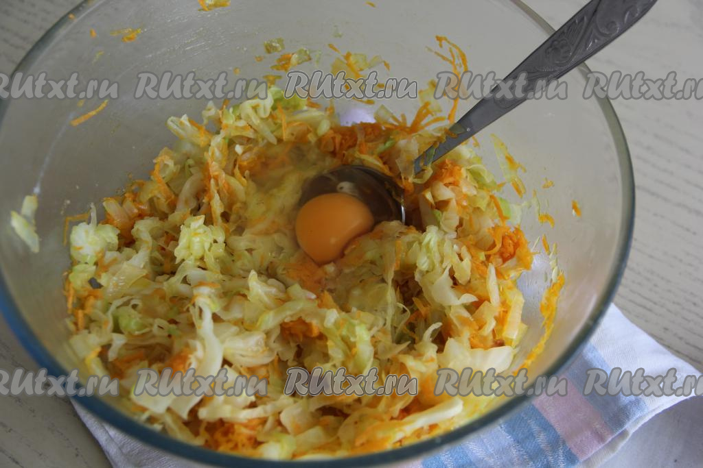 В миску с тёплой капустой добавить не горячие обжаренные овощи, яйцо, перемешать.