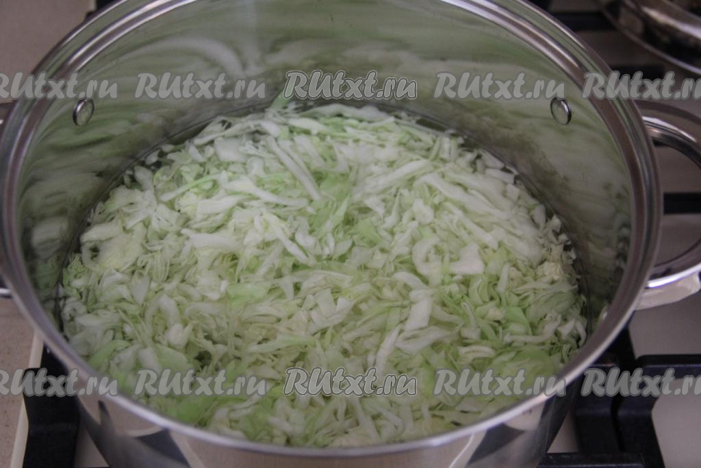 Воду влить в кастрюлю, довести до кипения, выложить нарезанную капусту, довести до кипения, уменьшить огонь. Затем, если капуста молодая, варить с момента закипания минут 5 (если капуста более поздних сортов, с момента закипания варить минут 7-8 - до мягкости). Затем выложить отваренную капусту в дуршлаг, чтобы избавиться от лишней жидкости, а потом переложить в объёмную миску (можно сразу с помощью шумовки вынимать капусту из кастрюли, давая стечь лишней жидкости, и сразу перекладывать в миску), дать немного остыть.