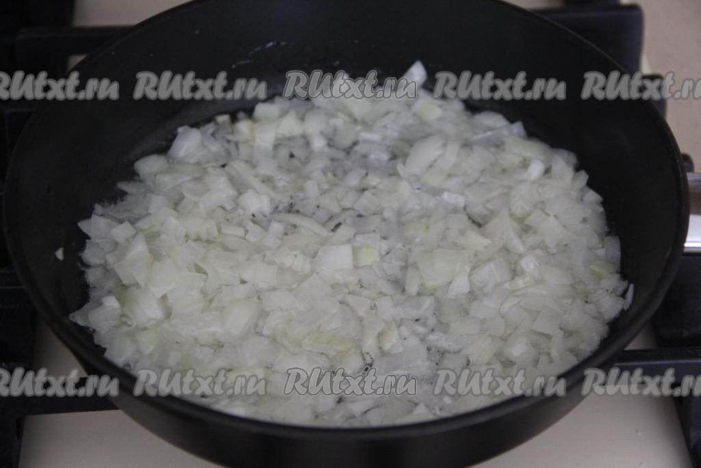 Влить в сковороду растительное масло, выложить в него мелко нарезанный лук и обжаривать его, помешивая, минут 5.