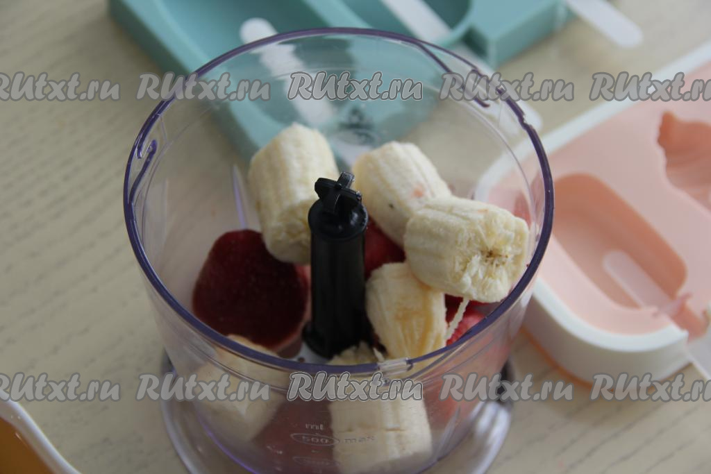В чашу измельчителя поместить кусочки очищенного банана и клубнику.