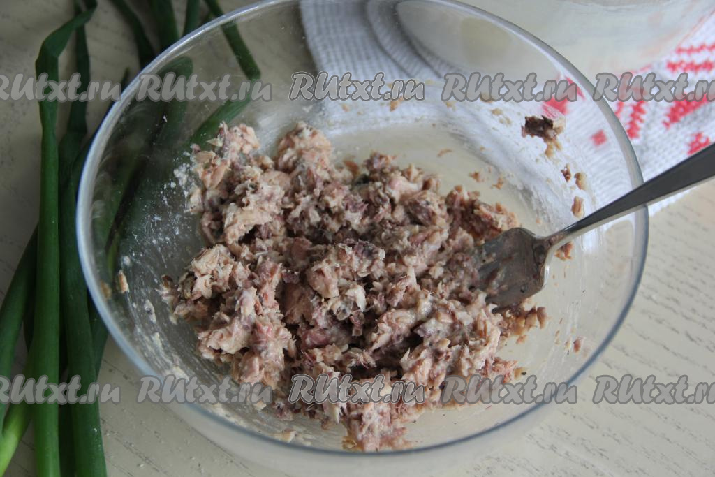 Для приготовления начинки рыбные консервы выложить в миску и размять вилкой.