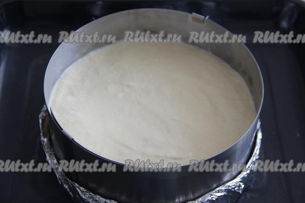 Выложить в форму половину теста и распределить ровным слоем. Я использовала для выпечки разъёмную форму без дна диаметром 22 сантиметров, поэтому дно сформировала из двух слоёв фольги.