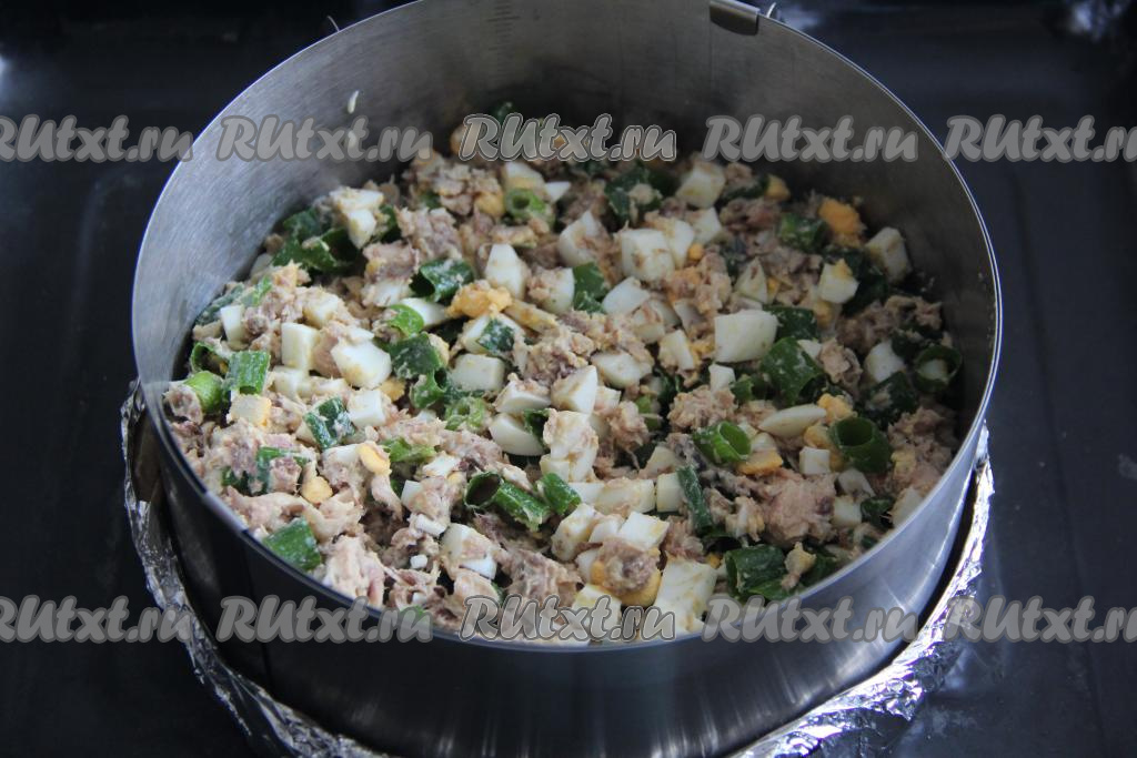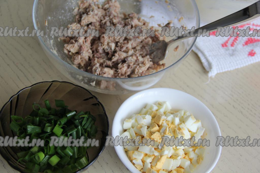 Подготовить продукты. 3 яйца для начинки предварительно сварить вкрутую (на это с момента закипания воды потребуется минут 9-10), а затем остудить их и очистить. Консервы можно взять любые в масле (например, горбушу, тунца или скумбрию).