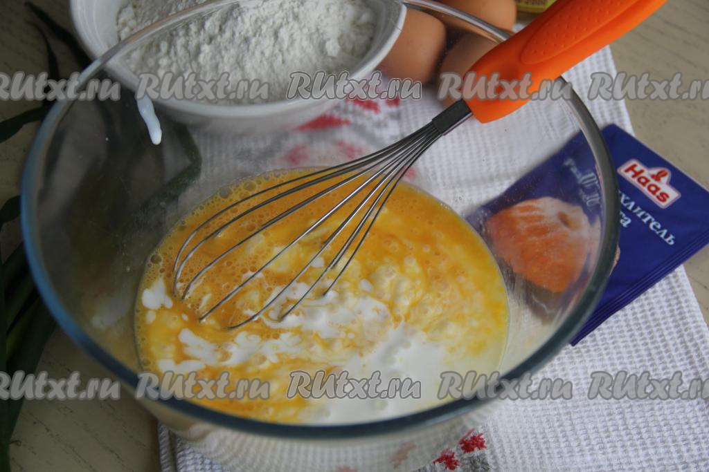 Для того чтобы замесить тесто, нужно вбить в миску яйца, всыпать соль и перемешать яичную смесь венчиком. Затем добавить сметану и влить кефир, перемешать.