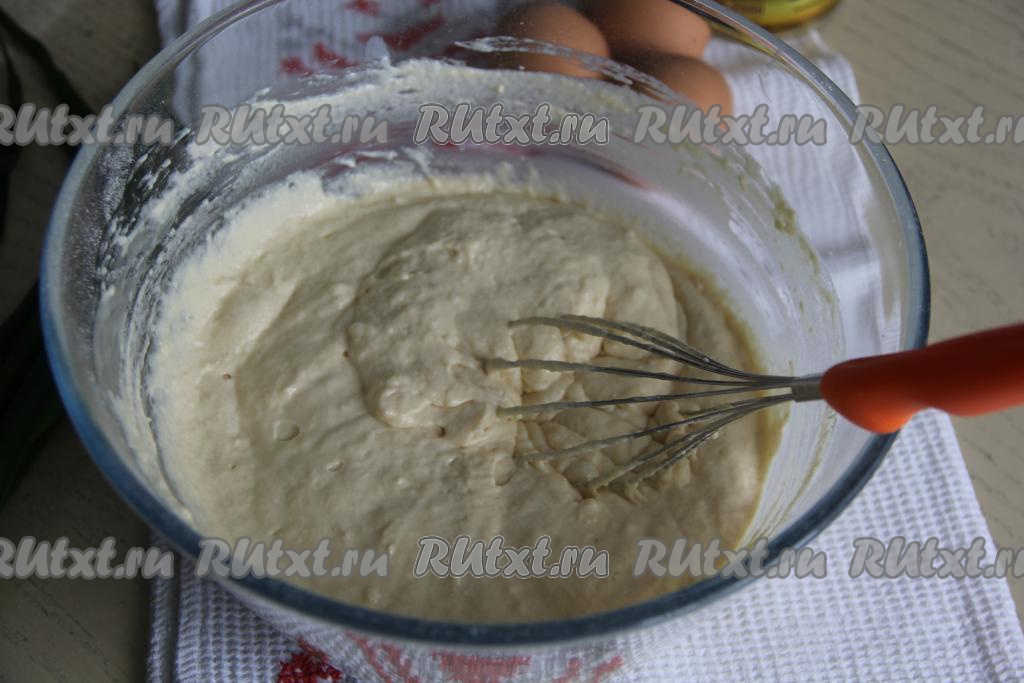 Перемешать тесто венчиком, оно получится в меру густым, однородным, напоминающим по консистенции тесто для оладий.