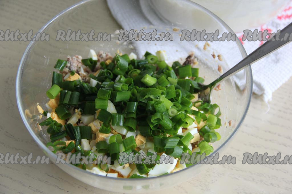Вымыть зелень (я взяла зелёный лук), лишнюю воду стряхнуть, затем мелко нарезать. 3 очищенных варёных яйца мелко нарезать.