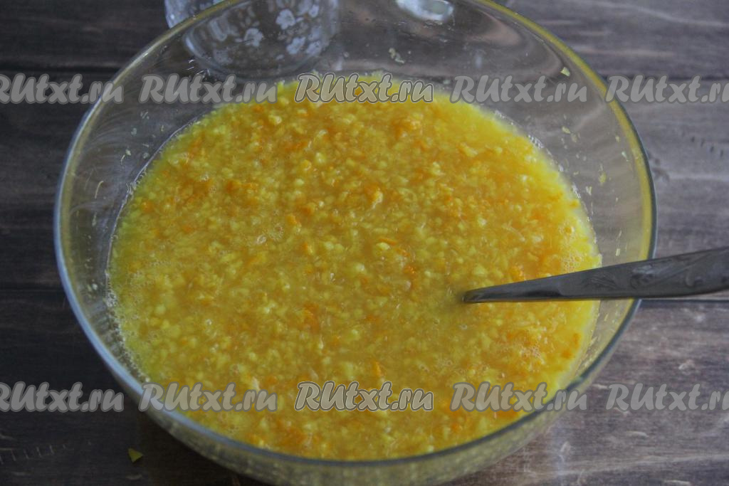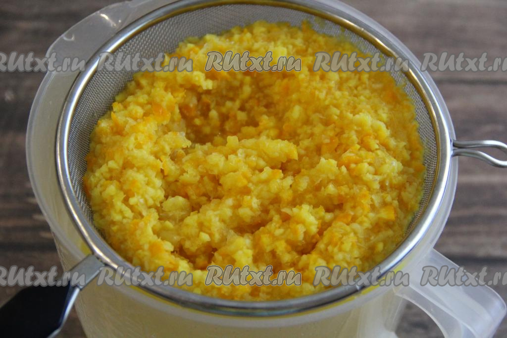 Процедить получившийся апельсиновый настой через ситечко. Жмых, оставшийся в сите, нам не понадобится.