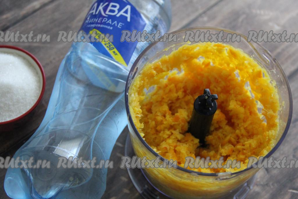 Апельсин нарезать на дольки, поместить в чашу измельчителя и пробить вместе с кожурой.