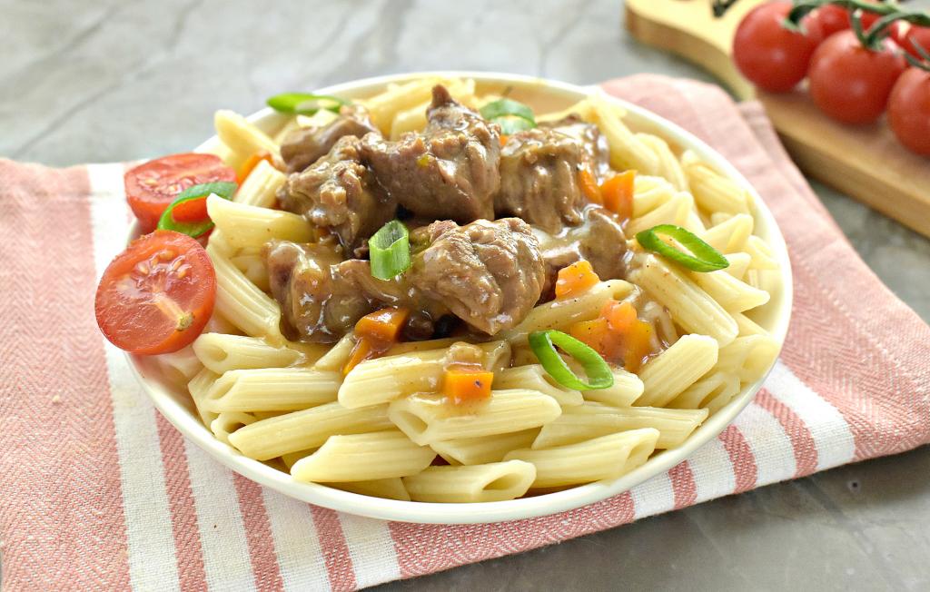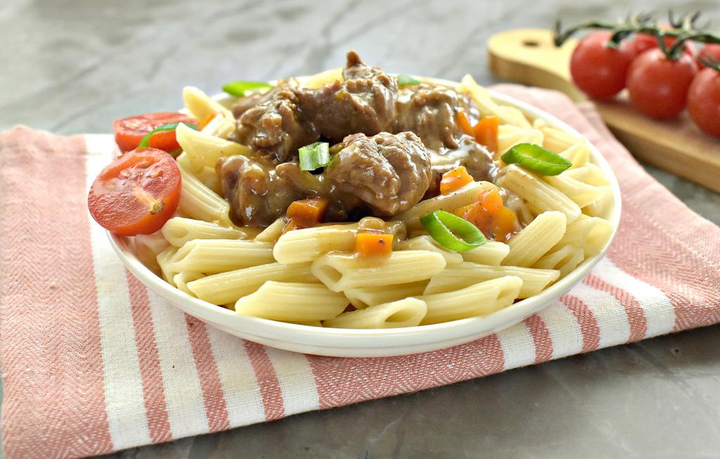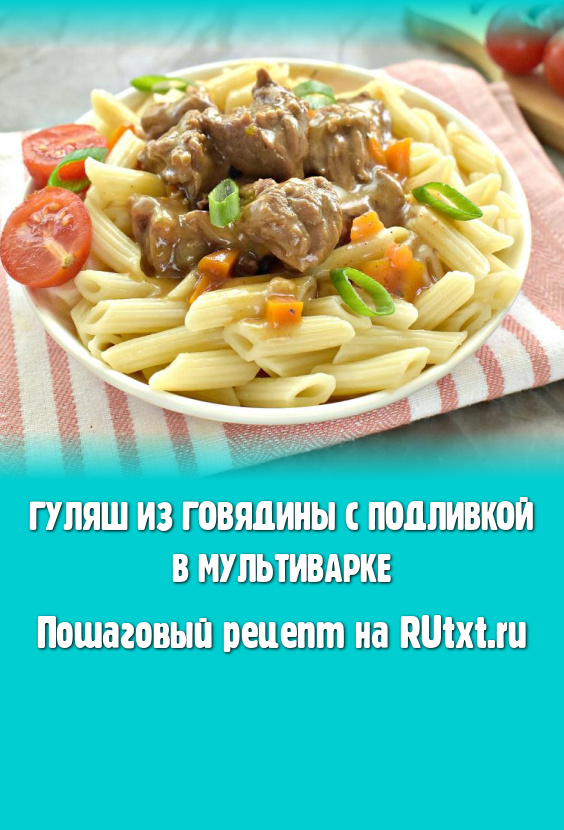 Сочный, вкусный, мягкий, в меру густой гуляш из говядины раскладываем из чаши мультиварки по тарелкам и подаём к столу с гарниром (я подала с макаронами), поливая подливкой, в которой тушилось мясо.