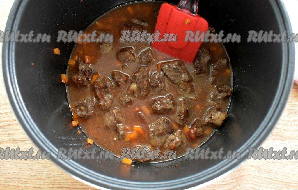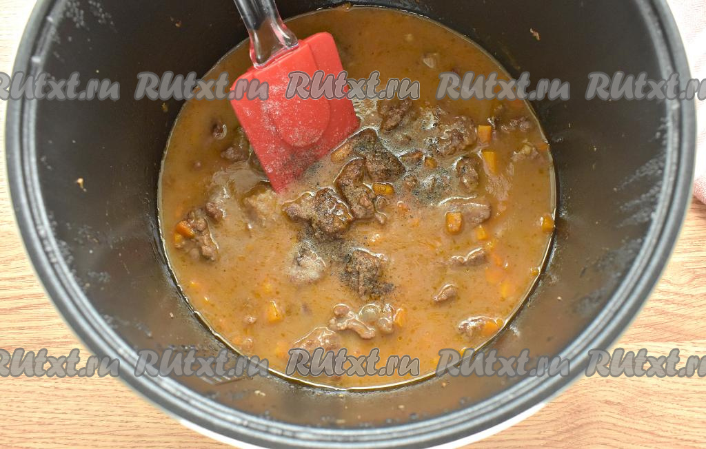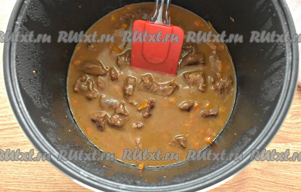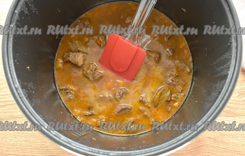 Открываем мультиварку, вливаем мучную смесь в гуляш, сразу перемешиваем.