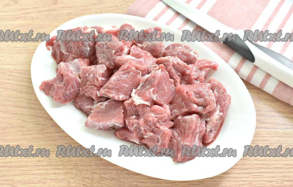 Говядину промываем, обсушиваем и нарезаем на небольшие кусочки (я нарезала на кусочки размером 3х3 сантиметров). Лук, зубчик чеснока и морковь очищаем.