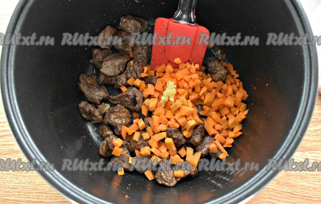 В чашу мультиварки (я готовила в мультиварке Redmond) наливаем растительное масло и включаем на 15 минут режим "Жарка". Как только прозвучит звуковой сигнал, выкладываем в чашу кусочки говядины и обжариваем их при открытой крышке, иногда перемешиваем. За 2 минуты до окончания программы добавляем к обжаренным кусочкам мяса нарезанную на кубики морковь и пропущенный через пресс чеснок, перемешиваем, обжариваем до окончания программы, иногда помешивая.