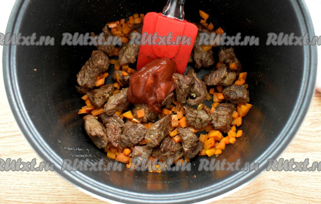 Затем выкладываем в чашу мультиварки томатную пасту, перемешиваем.