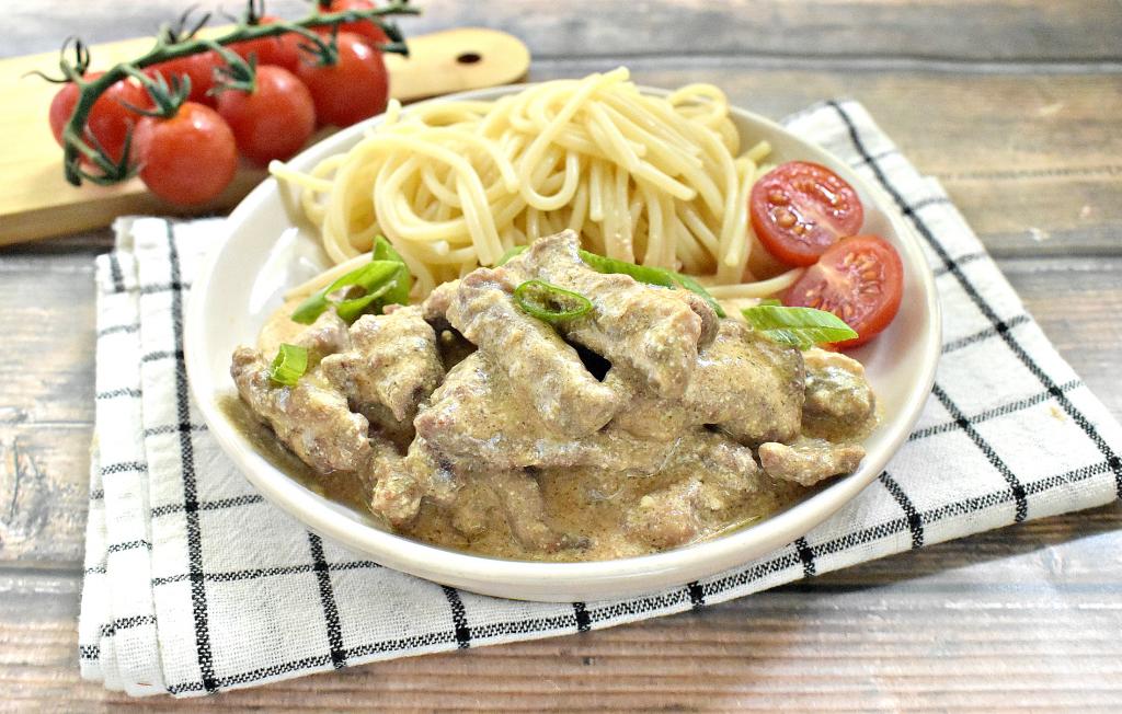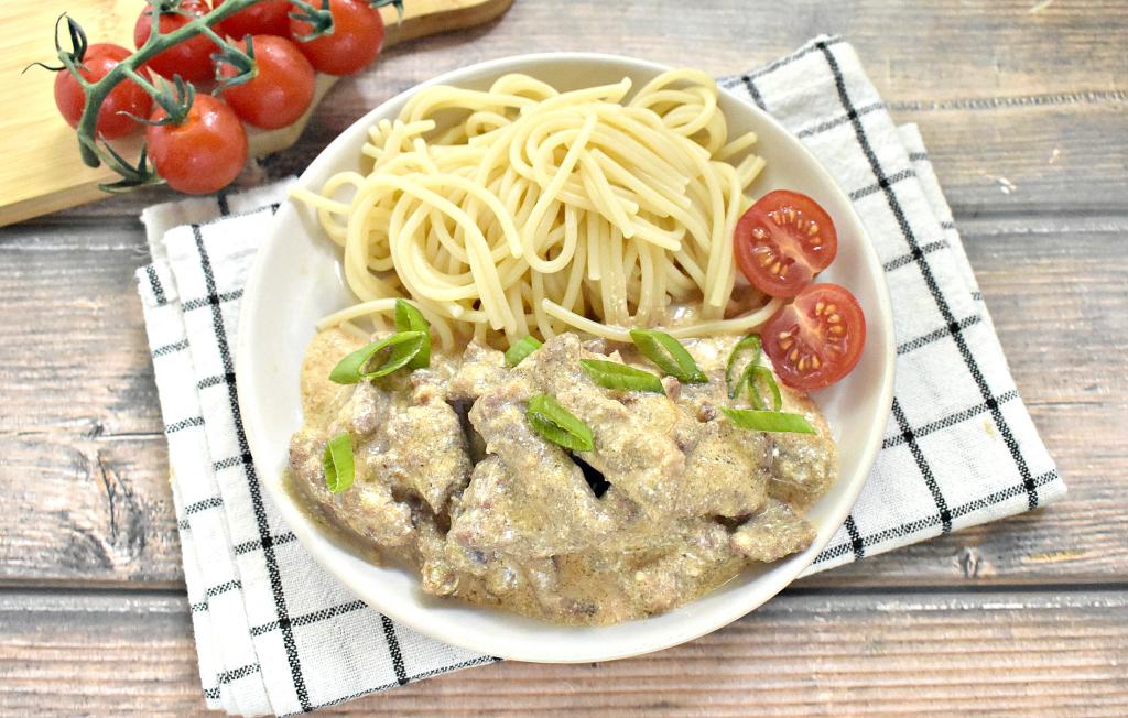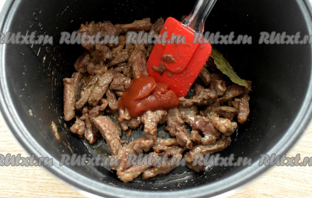 Сочный, мягкий бефстроганов из говядины, приготовленный в мультиварке, подаём к столу с любимым гарниром, дополнив его подливой, в которой тушилось мясо.