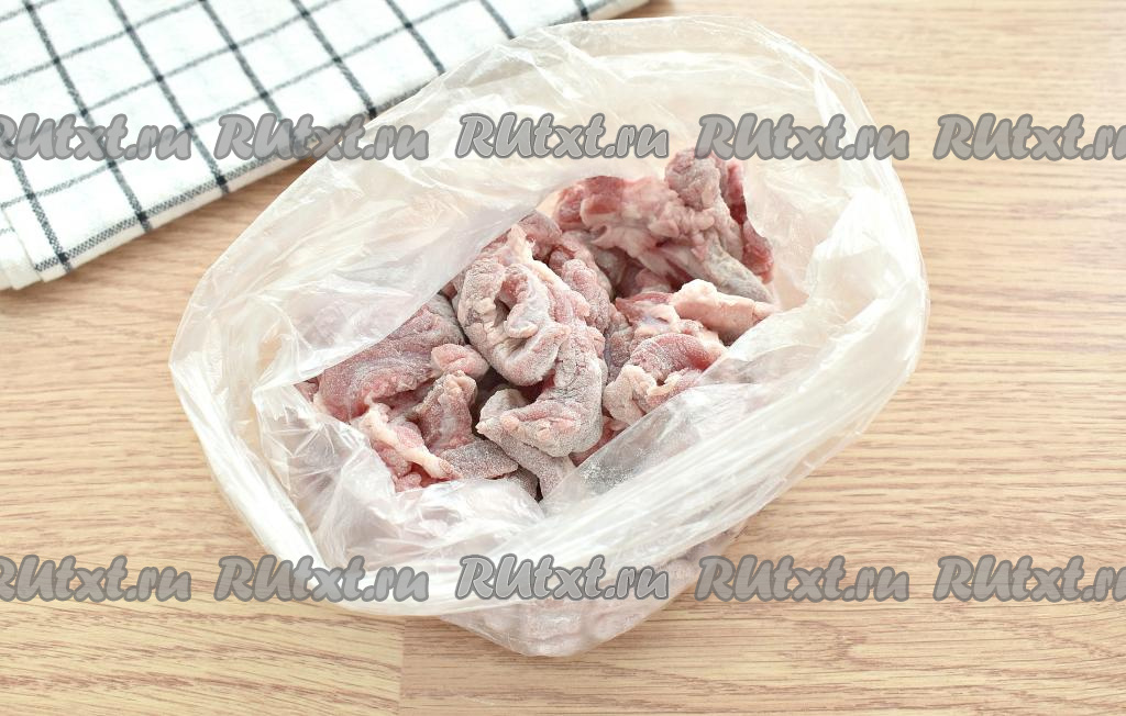 Нарезанную говядину перекладываем в целлофановый пакет, всыпаем 1 столовую ложку муки (или крахмала), закрываем пакет и встряхиваем, чтобы каждый кусочек мяса покрылся мукой (или крахмалом).