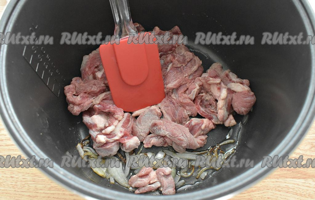 Луковицу очищаем и нарезаем (я нарезала на тонкие полукольца). Включаем мультиварку, устанавливаем на 20 минут режим "Жарка". Вливаем в чашу растительное масло. Как только масло прогреется и прозвучит звуковой сигнал, сразу выкладываем в чашу нарезанный лук. Обжариваем лук 3 минуты, периодически перемешиваем. Затем выкладываем кусочки говядины. Обжариваем мясо вместе с луком 15 минут, не забываем перемешивать. Мультиварку крышкой не закрываем.
