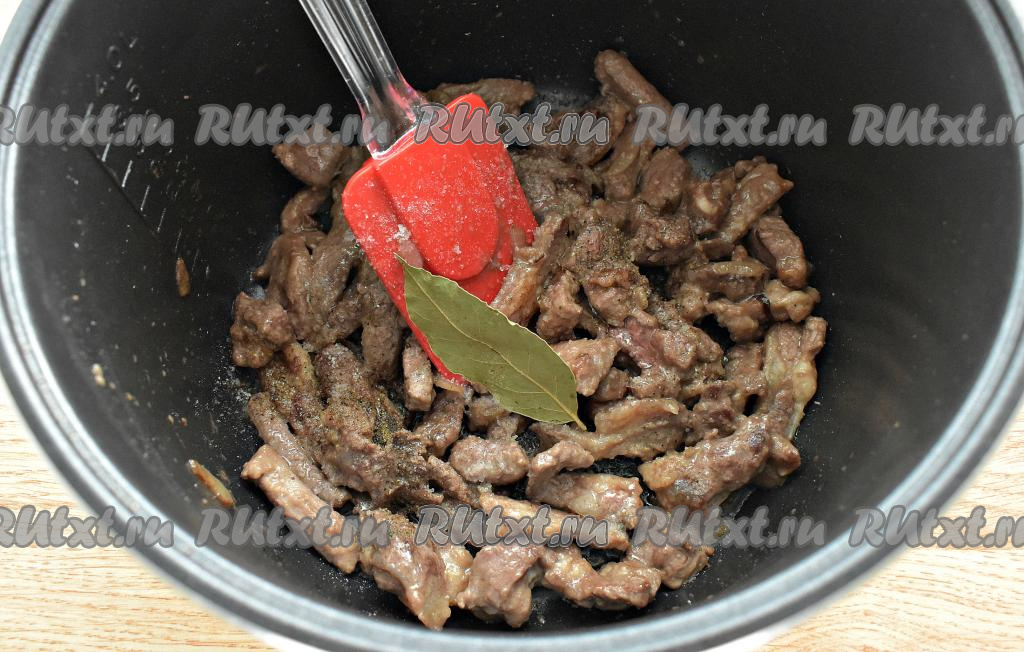 К обжаренным кусочкам говядины добавляем лавровый лист, по вкусу солим и перчим.