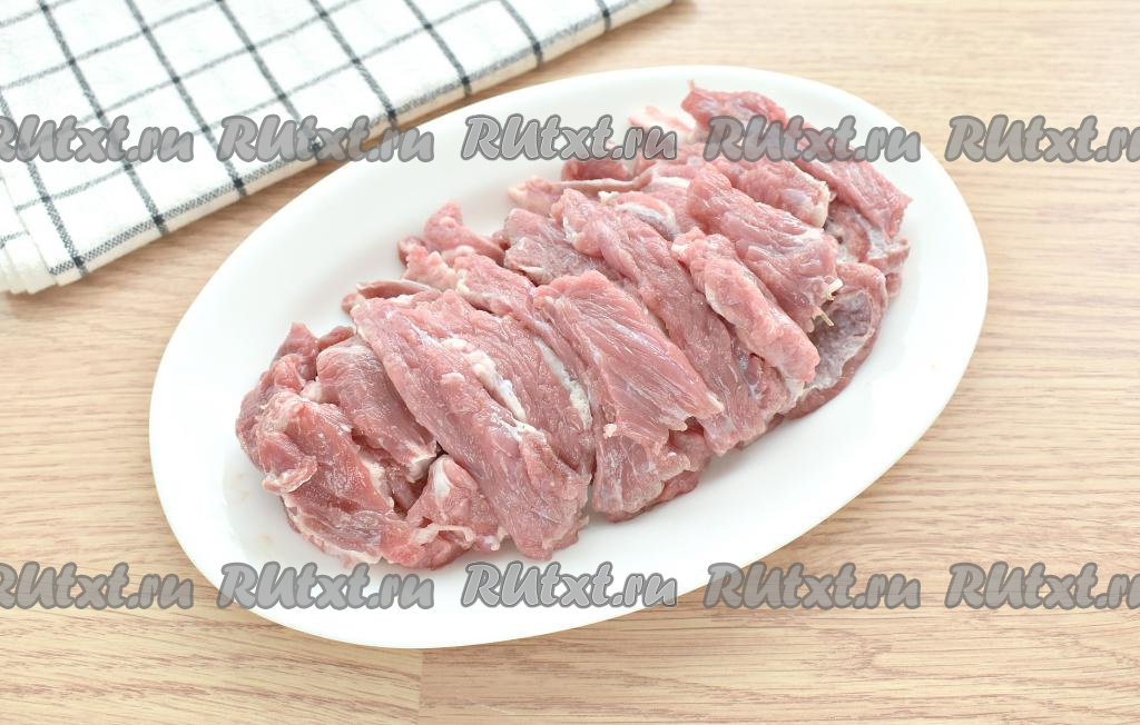 Говядину ополаскиваем водой, обсушиваем, а затем нарезаем мясо на длинные бруски (примерный размер кусочка 5 сантиметров на 1 сантиметр).