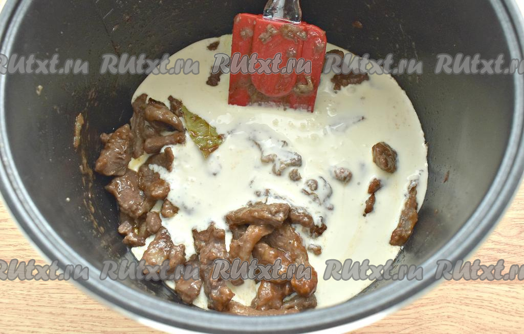 Сметану смешиваем с прохладной кипячёной водой и выливаем к мясу в мультиварку. Если хотите чтобы подливки было побольше, то добавьте ещё немного воды. Перемешиваем.