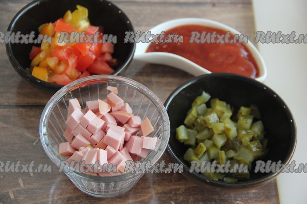 В отдельной миске смешать нарезанные огурцы, колбасу и помидоры, а затем выложить на смазанные кетчупом (или томатным соусом) багеты, заполняя хлебную лодочку.